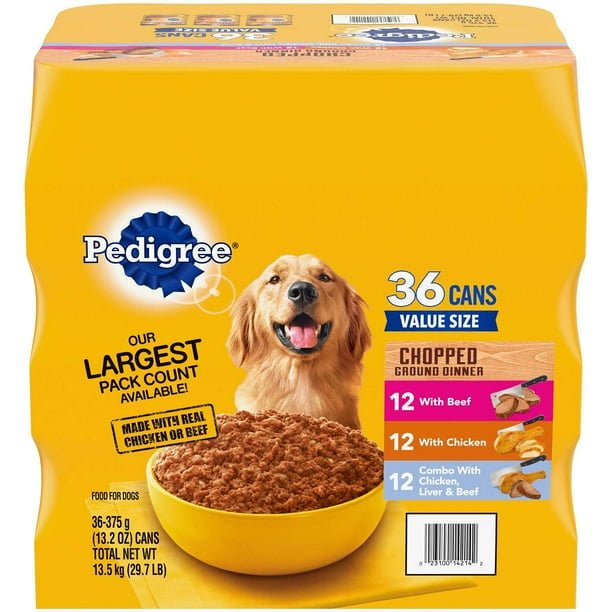 Keep your dog happy and full with the Pedigree Chopped Ground Dinner Variety Pack. This bulk case includes 36 large 13.2 oz cans with hearty, flavorful meals dogs love. Great for multi-dog households or stocking up.